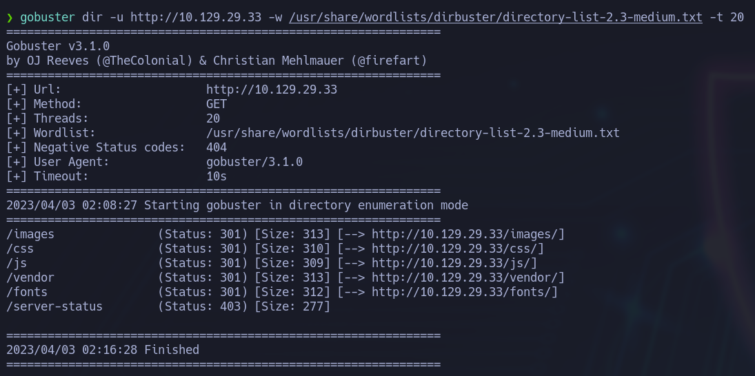gobuster dir -u http://10.129.29.33/ -w /usr/share/wordlists/dirbuster/directory-list-2.3-medium.txt -t 20