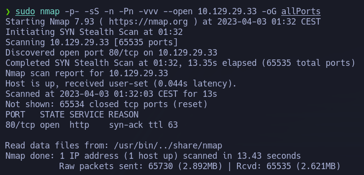 nmap -p- -sS --min-rate 5000 -n -Pn -vvv --open 10.129.29.33 -oG allPorts
