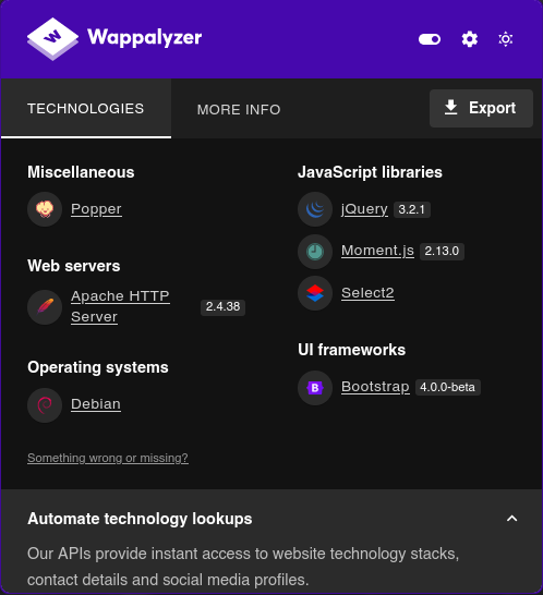 Con la extensión Wappalyzer podemos analizar desde el navegador los servicios y plugin que corren en la web de manera similar que con whatweb lo hacíamos desde línea de comandos